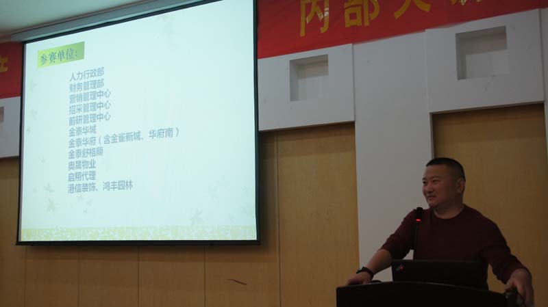 本屆活動(dòng)由運營(yíng)管理中心組織。參賽單位由人力行政部、財務(wù)管理部、營(yíng)銷(xiāo)管理中心、招采管理中心、前研管理中心、金泰華城、金泰華府(含金雀新城、華府南)、金泰舒格蘭、奧晟物業(yè)、啟翔代理、港信裝飾、鴻豐園林11支代表隊組成。