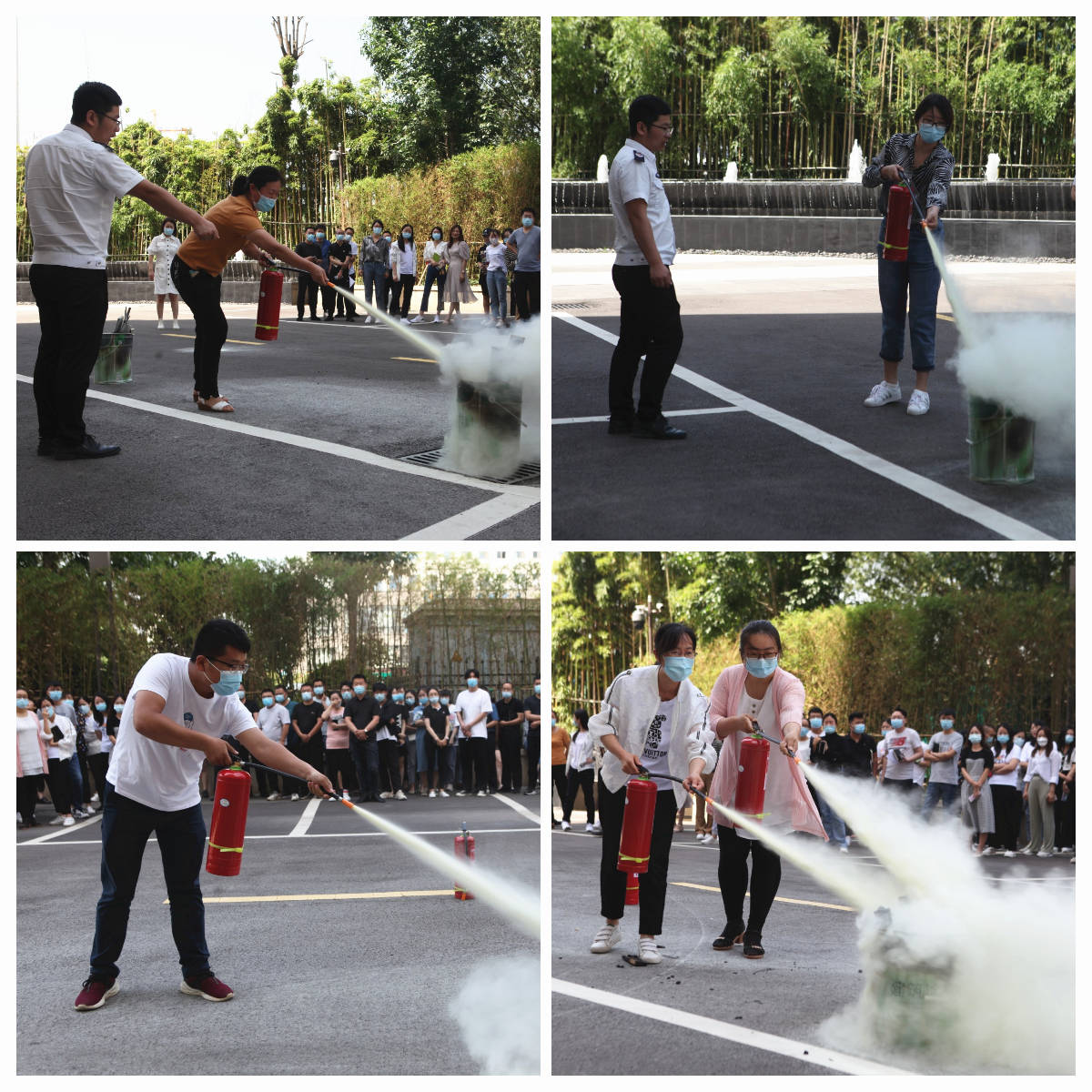消防演練中,員工學(xué)習操作滅火器